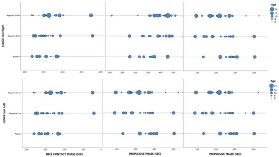 Regarding the lunge’s tests (Table 3), according to age, significant differences were only observed in the 10-year-old sample in the flat foot phase on the right foot (p = 0.022, with the rest of them having p-values greater than 0.05 (Figure 2).