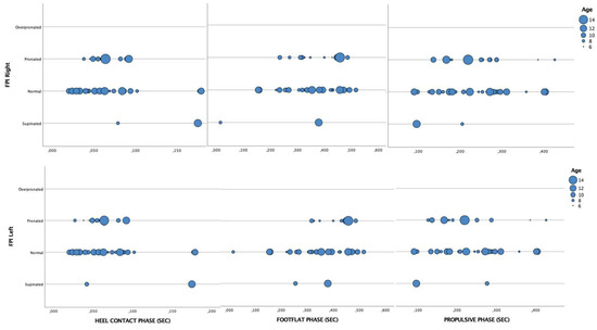Finally, another of the tests analysed, which also had an impact on gait, was the analysis of foot posture during pronation or supination according to the FPI, where it is observed that the mid-contact phase influences the result, producing a longer contact time in pronated feet than it does in neutral feet by 0.06 s. These data, although not obtained using the same measuring tool, are similar to those proposed by Ryan Mahaffey et al. [37], who proposed the increase in the pronation phase of the midfoot. Caravaggi et al. [38] showed significant postural and kinematic alterations in the midtarsal and tarso-metarsal joints of adolescents with planus valgus feet. The objective identification and quantification of planus valgus foot alterations via non-invasive gait-analysis is relevant to improving the diagnosis of this condition and to evaluating the effect of conservative treatments and of surgical corrections by different techniques.
