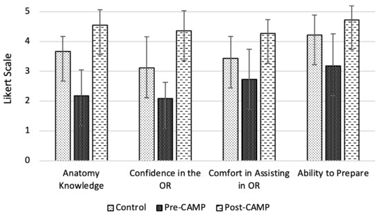 The fourth theme (Q4, Figure 2, Figure 3 and Figure 4) explored preparedness, defined as the ability to gather relevant information about the patient and surgery prior to the start of the procedure. The majority (53%) of the control group felt their preparedness was good or excellent, similar to the post-CAMP group (p = 0.06, mean (SD) 4.22 ± 0.67 vs. 4.73 ± 0.47). The CAMP did significantly improve the students’ preparedness (p = 0.003, mean (SD) pre-CAMP 3.18 ± 1.08 vs. post-CAMP 4.73 ± 0.47).