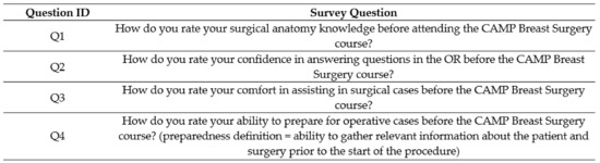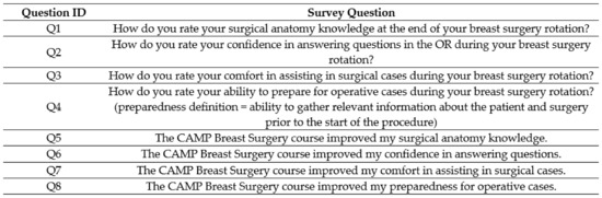 The MS3 students enrolled in the BSO rotation attended a breast surgery specific CAMP teaching session for an hour during the didactic week prior to starting their surgery clerkship. Before attending the CAMP session, the MS3s were issued a pre-CAMP survey, which mirrored the control survey (Figure 2). The students then attended the BSO CAMP teaching session as described above. After completing their BSO surgery rotation, the students were issued a post-CAMP survey (Figure 3), which contained supplemental questions assessing the influence of the BSO CAMP on their surgery rotation experience.