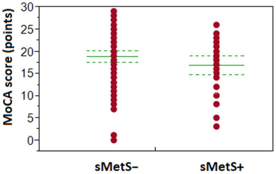 Impact of sMetS on the achieved MoCA score in the age group of 75+ years old participants. Group sMetS+ represents patient’s data with the presence of metabolic syndrome, and sMetS− are those without it. Solid lines in the centre of points (MoCA score) show the group means, while dotted lines represent boundaries of the appropriate confidence intervals.