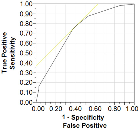 Receiver operating characteristic curve for a measure of discrimination of MoCA status (MoCA normal/MoCA lower cognitive performance) using three input variables (age, MetS status, education level).