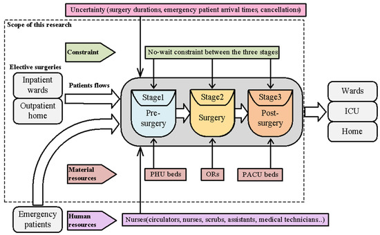 As medical technology improves day by day, more and more patients can be treated and saved through surgeries. Hence, operating rooms are in high demand in most hospitals. Operating rooms usually consume more than 9% of a hospital’s budget [1]. However, it is also estimated that operating rooms account for more than 40% of a hospital’s revenue [2]. Operating rooms are high-cost, high-revenue, and high-demand units. Finding an effective method for allocating surgeries to operating rooms that maximizes operating room utilization while ensuring good quality of care is a very important problem for hospital managers. In this research, we consider a daily surgery scheduling problem with three successive stages: pre-surgery, surgery, and post-surgery. The pre-surgery stage usually takes place in the PHU, where nurses help patients prepare for surgery (signing paperwork, putting on a hospital gown, performing necessary tests, measuring vital signs, setting up intravenous access, etc.). The surgery stage is the main stage of the entire operation, which takes place in the operating room. The post-surgery stage begins after the end of surgery and takes place in the PACU bed, where the patient is continuously monitored and cared for until recovery. The no-wait constraint is considered between the three stages. If no PACU bed is available after surgery, the patient remains in the operating room for recovery until a bed becomes available. Surgeries are known in advance (elective). Multiple resources are considered throughout the surgical process: PHU beds in the first stage; operating rooms in the second stage; and PACU beds in the third stage. The objective is to minimize the makespan. Figure 1 shows a typical patient flow in surgery and also shows the scope of this research.