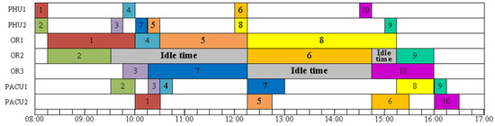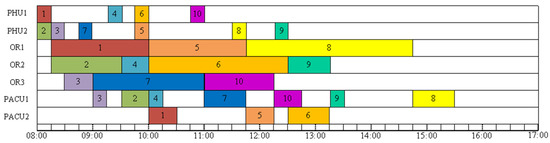 We calculate the lower limit (LB) of the tested problem instances in order to demonstrate the GA’s effectiveness. The lower bound is developed by [36] for solving a flexible flow shop to minimize the makespan. The studied problem has a no-wait constraint, so the lower bound developed for solving the flexible flow shop to minimize the makespan will also be the lower bound of the studied problem. Table 5 shows the results of the 10 surgeries under the 2 PHU beds, 3 ORs, and 2 PACU beds available. The average value of GA is 366.1 (minutes), which is about 6 h. If the first surgery starts at 8:00, then the last surgery would end at around 14:00, excluding lunch hours. Both the GA and the LPT can find solutions that finish 10 surgeries within 8 working hours.