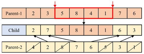 Two parent solutions are selected from the population based on a roulette wheel mentioned above for crossover. The crossover scheme is a two-point crossover operator [35], as depicted in Figure 4. The surgeries between two randomly selected points are always inherited from Parent-1 to the child. The rest of the chromosome is filled by reading the information of Parent-2 from left to right. This crossover is executed under a probability . After crossover, there are offspring generated.