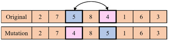 The mutation happens in offspring under a probability . The mutation scheme merely employs a general pair-wise exchange. Two surgeries are chosen at random, and then their positions are switched. The mutation scheme is illustrated in Figure 5.