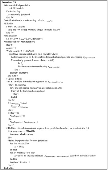 We consider giving the GA a good initial solution to guide the GA’s search in a good direction. Hence, a solution based on the longest processing time first (LPT) heuristic is developed. The LPT heuristic is described below.