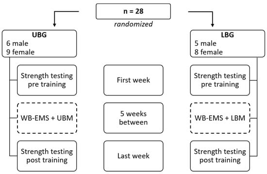 Overview of the study design and procedure. UBG: upper body group; LBG: lower body group; WB-EMS: whole-body electromyostimulation (dashed frame); UBM: upper body exercise movements; LBM: lower body exercise movements.