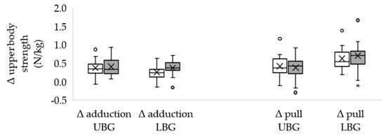 Differences between the final and the initial body weight adjusted maximum upper body strength (arm adduction and arm pull) in the upper body group and in the lower body group. Δ: differences; UBG (n = 15): upper body group; LBG (n = 13): lower body group; white box: right arm; grey box: left arm; circles represent discordant values; means are displayed by crosses and medians by crossbars; * significant difference between LBG and UBG, p < 0.040 (effect size r = 0.39).