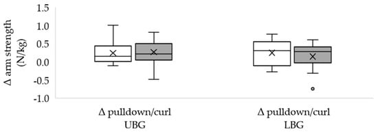 Differences between the final and the initial body weight adjusted maximum arm strength (biceps curl and triceps pulldown) in the upper body group and in the lower body group. Δ: differences; UBG (n = 15): upper body group; LBG (n = 13): lower body group; white box: triceps pulldown; grey box: biceps curl; the circle represents a discordant value; means are displayed by crosses and medians by crossbars; no significant differences occurred.