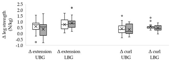 Differences between the final and the initial body weight adjusted maximum leg strength (leg extension and leg curl) in the upper body group and in the lower body group. Δ: difference; UBG (n = 15): upper body group; LBG (n = 13): lower body group; white box: right leg; grey box: left leg; circles represent discordant values; means are displayed by crosses and medians by crossbars; no significant differences occurred.