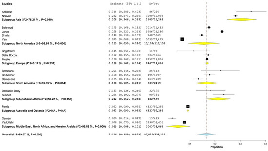 Subgroup analyses were provided when the prevalence was stratified by region, the level of BAC, and quality of the primary study.