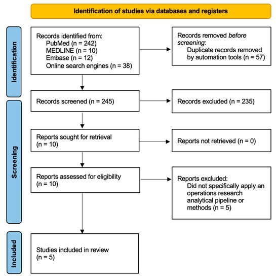 The database searches yielded 264 citations, of which 245 were unique (Figure 1). Searching on various online engines revealed another 38 papers. Through title and abstract screening, we identified 10 potentially relevant studies whose full text was subsequently examined. 5 studies were excluded due to not specifically using an operations research analytical pipeline or methods to conduct their investigations. As such, five studies were retained with years of publication ranging from 1996 to 2019.