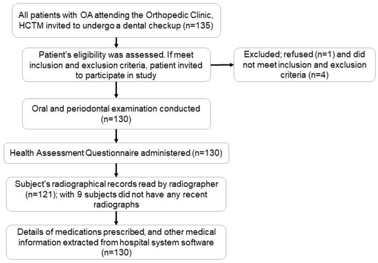 The flowchart of the steps of subject recruitment and data collection is reported in Figure 1. The demographic characteristics and periodontitis diagnosis of the study participants are shown in Table 1. The participants were mostly older adults with a mean age of 61.5 (±9.3). Out of the 130 participants with OA, 98 (75.4%) had knee OA, 7 (5.4%) had hip OA and 6 (4.6%) had hand OA, while 19 (14.6%) had a combination type of OA.