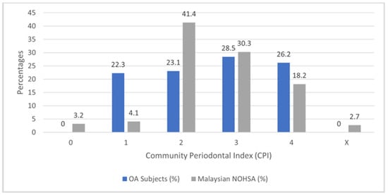 From the 130 participants recruited, 71 (54.6%) had periodontitis. Generally, the OA participants had a higher proportion of periodontitis compared to the Malaysian NOHSA findings of 48.5% []. The severity of periodontitis suffered by the OA participants was also greater, with more participants having a CPI of 4 compared to the NOHSA findings. This is shown in Figure 2.