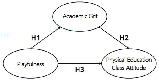 The hypotheses of this study were based on the effects of the playfulness of middle-school PE on academic grit and PE attitudes in the Republic of Korea. The hypothetical model is illustrated in Figure 1.