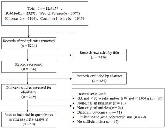 Exclusion criteria: (1) the original study was not available; (2) the definition of BPD was unclear; (3) the outcomes were BPD or death, and data from separate categories of BPD (mild, moderate, and severe); (4) studies limited to gene polymorphisms; (5) the research types were animal studies, reviews, commentaries, editorials, case reports or republished articles.