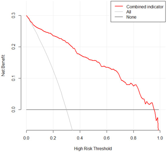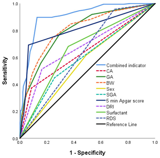 The ROC curves were drawn for the validation cohort. The AUC value was (0.907, 95% CI [0.883, 0.931]) predicted by combined indicator (CA, GA, BW, Sex, SGA, 5 min Apgar score, DRI, Surfactant, RDS), sensitivity was 0.897, and specificity was 0.873 (Table 2). The ROC curves showed that the prediction performance of combined indicators was better than that of single indicator (Figure 3). Meanwhile, The Hosmer–Lemeshow test demonstrated that the tool showed a good fit (p = 0.3572), and the calibration curve showed excellent agreement between the predicted and actual observations, indicating that the tool had good consistency (Figure 4). Furthermore, the DCA showed that the red curve is higher than the two extreme lines, reflecting a significant net benefit of the tool (Figure 5).