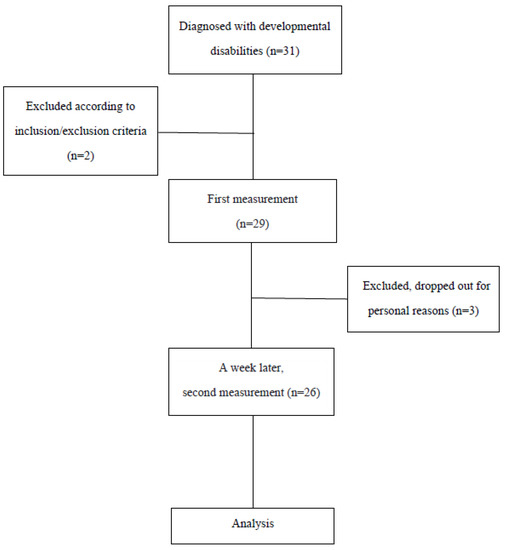 The subjects of this study were 31 children who were diagnosed with developmental disabilities and were receiving treatment at D hospital, located in Daejeon city, South Korea. Of these, 26 children whose parents provided consent and who participated in the second measurement were recruited (Figure 1).