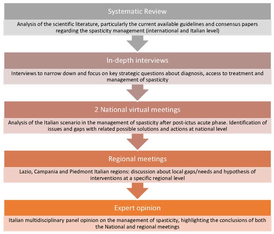 This research is based on a mixed method, as already described in the literature [24,25], taking into account (1) a systematic review of the currently available international guidelines and consensus papers regarding spasticity management and (2) expert panels’ virtual meetings which involved a multidisciplinary panel of Italian physicians with expertise in the management of PSS. In order to take into account possible differences in the health system organization of the various Italian territories, physicians were chosen to be representative of four main Italy regions, namely in the south (Campania), center (Lazio), and north (north-west Piedmont, north-east Veneto) of Italy. Details on the mixed-method research flow are reported in Figure 1.