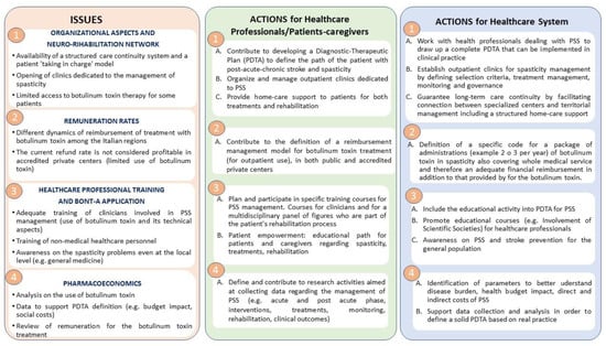 As to the results of the expert meetings, Figure 3 reports the most relevant issues identified by the panel. Furthermore, Figure 3 reports the actions needed in order to improve the current management of post-stroke spasticity.