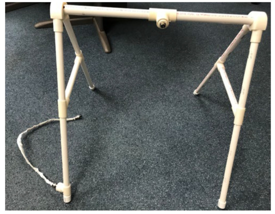 The HUGS-1 toys, as pictured in Table 1, are the descendants of earlier variants. See Supplement B for a description of this early evolution. HUGS-1 testing began with a bar toy that was suspended via a square where the baby grasped an FSR-embedded horizontal member to activate lights on the vertical members of the square when visual mode was selected (see Figure 6). The toy design changed to integrate the lights into the bar itself (see Table 1, pane a) on the theory that it would be easier for the baby to associate light with touch if the light occurred where the touch did. Finally, a single-arm tripod (see Supplement B) was exchanged for a more stable two-tripod support with a bar suspended between them where the cameras could be mounted.