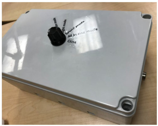 HUGS-1 consisted of two instrumented toys (the bar toy (Table 1, pane a) and the candy toy (Table 1, pane b)), which could be hung from an A-frame (Figure 1), placed so that the infant, seated in a standardized (and easily cleanable) infant seat (Figure 2), could easily reach the toys. The toys were embedded with force-sensing resistors (FSRs) and wired through the A-frame to an array of Arduino® Uno microcontrollers housed in an electronics box. A dial mounted to the electronics box (Figure 3) controlled functions of the Arduino array, which routed signals to and from the A-frame/toy complex. One of the initial HUGS research hypotheses was that the type of sensory feedback babies received when they handled a sensorized toy would influence the strength and duration of their grasp. As a result, the protocol called for grasp testing in three modes: visual (flashing colored lights), auditory (music), and haptic (vibration). Parents/researchers turned the dial to select (simple randomization) the stimulus to attract the infant to explore the offered toy.