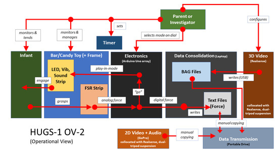 We devised an end-to-end tele-support plan that coordinated contactless drop-off of HUGS-2 hardware, system orientation, coaching, and troubleshooting. We greatly expanded the HUGS-1 user manual into a study website (https://sites.google.com/cua.edu/hugs/home, accessed on 26 February 2023), providing detailed, online, how-to materials, with step-by-step video instructions on HUGS-2 set up and operation. Training was carried out over Zoom with parents simultaneously logged in on the HUGS study laptop and on their smartphones to share views of both the software running on the laptop and the toy bar, electronics box, and other physical system components.