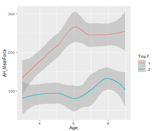 We detected an interaction effect (p = 0.063, α = 0.1) for the magnitude of mean grasp force between infant age and whether the infant was part of the TD (HUGS-1) or at-risk (HUGS-2) group. This suggests that as age increased, the average (mean) grasp force exerted on the bar toy by the HUGS-2 at-risk babies increased significantly faster than it did in the HUGS-1 TD babies (see Table 4, Mean Grasp Force (b)).