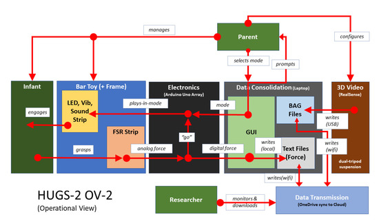 Foremost among the system changes needed to support autonomous use was to make HUGS easier for parents to set up and operate. Compared to HUGS-1 (see Figure 5), HUGS-2 incorporated greater technical complexity but presented the user with fewer, disjointed tasks. Figure 8 sets out the components of the HUGS-2 system and how they worked together. Greater technological complexity is exemplified by the replacement of written instructions to the user for navigating the various tasks involved in collecting HUGS data with a custom GUI and automated data upload process using commercially available technology (i.e., Microsoft OneDrive).