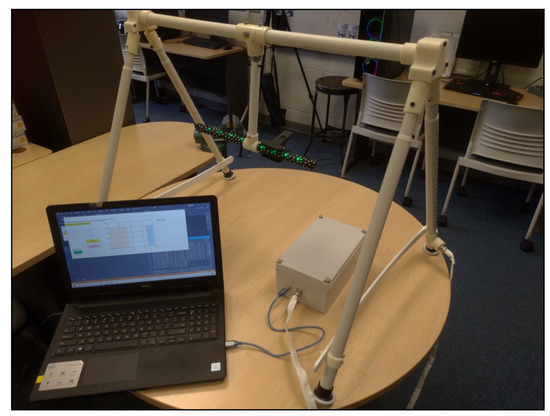 From the perspective of parent burden, the setup and connection of HUGS-2 components only differed from what was required for HUGS-1 in the elimination of the need to collect two sets of grasp data on two toys that the retirement of the candy toy brought about. As in HUGS-1, the toy bar/frame connected to the electronics box, which, in turn, was connected to the USB-2 port of the study laptop (see Figure 9). Additionally, since HUGS-2 needed to be packaged for hand-off with as little physical contact with the family as possible, the A-frame members were redesigned to fold so the unit could be transported flat. This feature also made it possible to collapse the unit and store it out of the way, perhaps under a bed, between HUGS sessions.