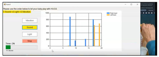 To run the HUGS-2 session, the parent would open one of two custom GUIs (graphical user interfaces) on the laptop. One GUI walked the parent through collecting spontaneous movement video while the other provided guidance on the more complex task of collecting grasp force data (see Figure 10). The grasp force GUI took the parent through the entire data collection process step by step. It instructed the parent when to turn on and turn off the RealSense™ camera. It provided the parent the simple random order for testing light, sound, and haptic feedback modes, which the parent selected by clicking buttons presented on the GUI display. This functionality replaced the analog dial on the HUGS-1 electronics box. The GUI also provided a timing function to signal to the parent when it was time to transition the infant from the present feedback mode to the next. This function replaced the standalone timer that was part of the HUGS-1 process. The GUI also provided a visualization of the magnitude of the forces exerted by the infant’s left and right hands at five second intervals during data collection.