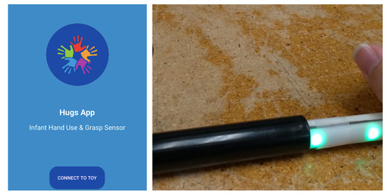 Making the A-frame collapsible did not have the desired effect as parents were reluctant to take the system down once it was assembled. The size of the system became a clear issue during HUGS-2, when it was left in the home for the duration of testing (up to nine months). Because it was in the way of family traffic, the rate of breakage and corresponding system downtime was high. Our current thinking is to dispense with the frame all together, put the toy bar in the baby’s hand, and collect grasp signals wirelessly to an app using Bluetooth technology. Figure 11 provides a screenshot of our current Hugs App prototype and the toy bar (without its baby-friendly covering) that it regulates.