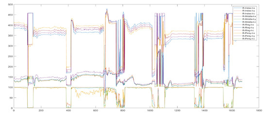 As previously mentioned, in the time since HUGS development and testing have been ongoing, validation data for an assessment of infant hand use, the HAI or Hand Assessment in Infants, were published [32]. The HAI presumes that infants will be able to freely manipulate and maneuver the toys they grasp. The toys that make up the HAI “kit” are untethered, in contrast to the HUGS concept where toys are suspended from a rigid bar. Preliminary analysis of grasp data from HUGS-2 revealed very little vertical movement since infants’ hands were preoccupied with the bar toy, which they explored by moving their hands across its surface horizontally. Figure 13 shows supination and pronation around the toy bar, with a characteristic limited range of vertical movement.