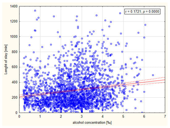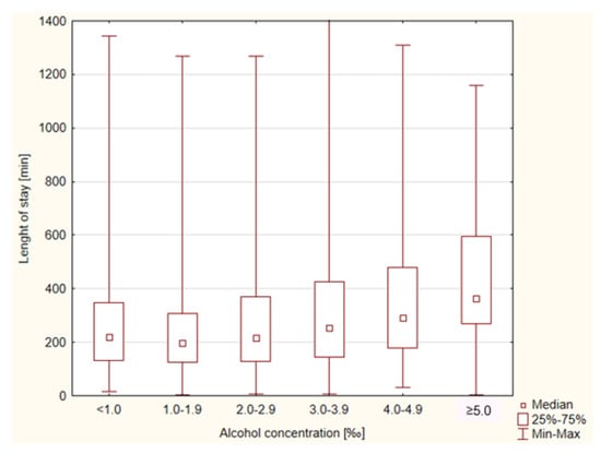 First, data were extracted from the hospital information system and prepared in a database created in Microsoft Excel (Microsoft Corporation, Redmond, WA, USA). Then, analysis was performed using Statistica 12 software (Tibco Inc., Tulsa, OK, USA). Descriptive statistics of measurable variables were performed. The categorical variables were expressed as numbers (n) with percentages (%) and quantitative data as medians (interquartile range), as they did not present normal distribution (confirmed by Wilk–Shapiro W test). To evaluate the relationship between blood alcohol concentration (BAC) and LOS, linear regression with Pearson’s linear correlation coefficient was used as appropriate. To perform the multivariate analysis, we used two models. A multivariate regression was used for analysis of the association between quantitative variables (BAC and age) and LOS. A two-way ANOVA test was used for multivariate analysis of categorical variables. For this purpose, the group was divided according to BAC (‰) (<1; 1–2; 2–3; 3–4; >4). The strength of the effect (eta2) was given only for statistically significant relationships. A value of p < 0.05 was considered statistically significant.