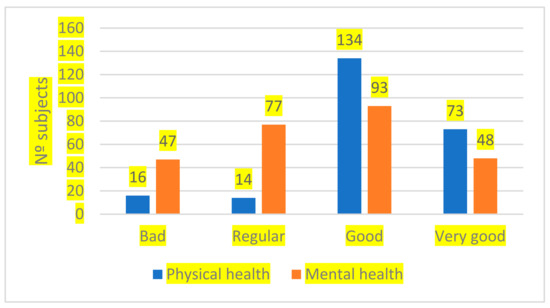 Finally, the results of the regression analysis indicated that the perceived mental health in the inmates is explained to a greater extent by the perceived physical health, which is in line with the existing scientific literature, highlighting the relationship between the attitude towards physical health itself and the perception of mental health [3,50]. In this respect, physical activity is considered as the major factor responsible for the indirect effects between both constructs [51].