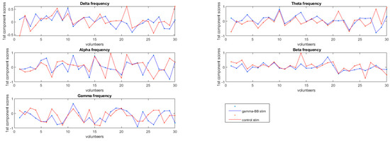 Plot of the scores of the first component per volunteer for the stimulation phase in a rest state across the bands (delta, theta, alpha, beta, and gamma).