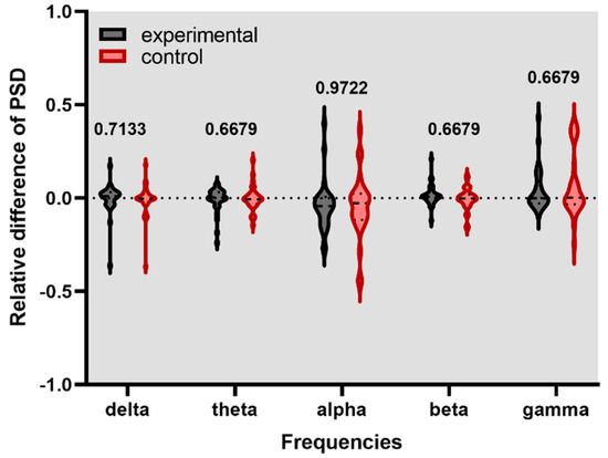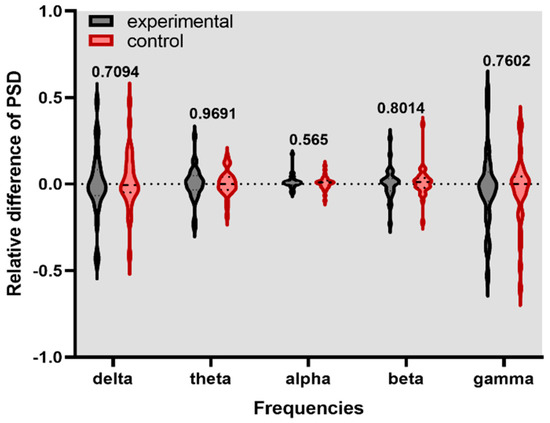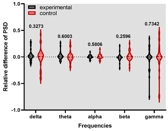 Figure 4, Figure 5 and Figure 6 show the violin graph of the relative PSD of channel F2 in experimental and control conditions across the delta, theta, alpha, beta, and gamma frequencies and their respective p-value. The positive values of the y-axis mean higher energy for the stim phase compared to the without stim, while the negative values indicate the opposite.