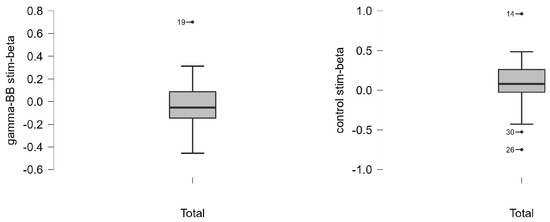 Boxplot of 1st component in resting state in beta frequency with outliers labeled for gamma-BB and control stim.