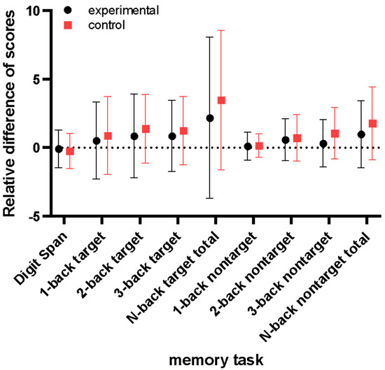 In order to compare the experimental to the control stim, without and during tasks, the features—PSD and task scores—of the phase without stimulation were subtracted from the stimulation phase (experimental and control). The learning effects that can be caused by the performance of memory tasks were repeatedly decreased by Latin squares rotation and the standardization by the phase without stimulus.