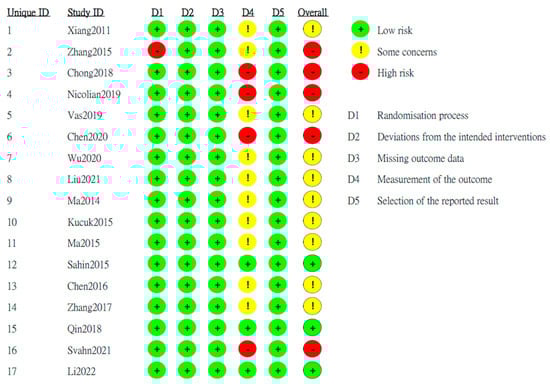 - Sterne, J.A.C.; Savovic, J.; Page, M.J.; Elbers, R.G.; Blencowe, N.S.; Boutron, I.; Cates, C.J.; Cheng, H.Y.; Corbett, M.S.; Eldridge, S.M.; et al. RoB 2: A revised tool for assessing risk of bias in randomised trials. BMJ 2019, 366, l4898. [Google Scholar] [CrossRef] [PubMed]