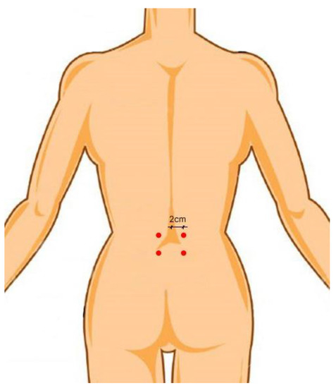 Each participant received training in the necessary muscle tests and exercises prior to having electrodes placed. After making sure that the subjects would successfully complete each intervention protocol, we prepared the intended electrode placement sites on skin with fine sandpaper and sterilised it with 70% isopropyl alcohol. If there was an overabundance of hair, it was shaved off. When required, the researchers made sure to cue the subjects to avoid any unwanted or trick movements during the test session exercises. The Nihon Kohden II machine (Nihon-Kohden Co., Tokyo, Japan) was used for EMG data collection at 200–500 microvolt and 10 milliseconds with a low- and high-cut filter at 50 Hz and 3 kHz, respectively. In order to record the electromyographic activity, we used disposable silver/silver chloride electrodes (Noraxon USA, Inc., Scottsdale, AZ, USA). In addition, electrode placement was secured using micropore tape to prevent the electrodes from slipping around and to maintain their adherence while the subjects were working out. Bilateral LM muscles were sampled for EMG recordings in all the subjects. The LM muscle was studied by means of a 2-channel EMG. Each electrode was positioned 2 cm laterally, with the lumbosacral junction as the target. The anterior superior iliac spine served as a reference point for the electrode. The electrodes were placed in accordance with the guidelines established in a prior study [34]. The electrode placement was performed as depicted in the schematic diagram in Figure 1. A maximum voluntary isometric contraction (MVIC) test was conducted for LM muscles using prone trunk extension, with additional resistance provided at the upper thoracic region. The amplitude of the resulting EMG signal was recorded for use in data normalization. Manual muscle testing typically used by physical therapists served as a guide for the test positions employed, albeit additional manual resistance was provided to the back muscles in the tests performed in the experiment [7,9]. The highest amount of force that could be incorporated manually was applied and kept constant for 5 s. Verifying proper electrode placement during manual muscle tests also involved analysing the EMG amplitudes recorded.