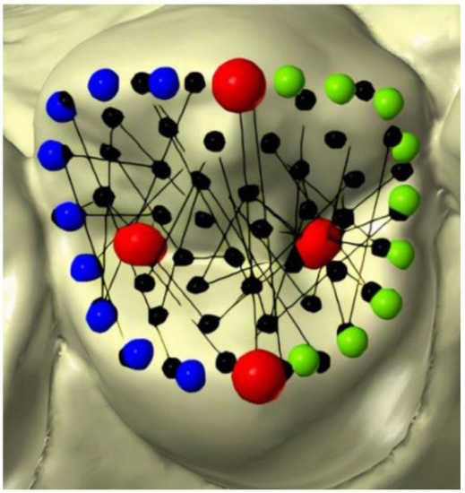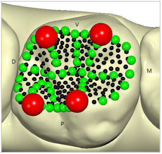 - Four fixed landmarks were manually placed in correspondence with the mesio-palatine, disto-palatine, disto-buccal, and mesio-buccal cusps. All the landmarks were initially projected from an occlusal view and double-checked by rotating the models (four red dots).