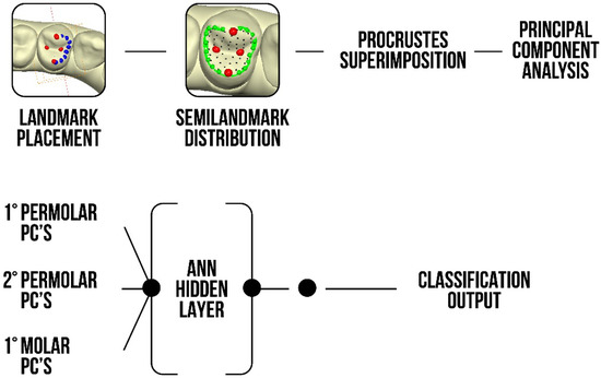 After the creation of a covariance matrix to represent the variation of each variable with respect to the others, a principal component analysis (PCA) was performed, and the first 30 components were considered for each tooth. Together with these components, the natural logarithm of the centroid size was also considered as a predictor. A total of 93 predictors were used to create an artificial neural network (ANN) with the aim of classifying subjects by gender.