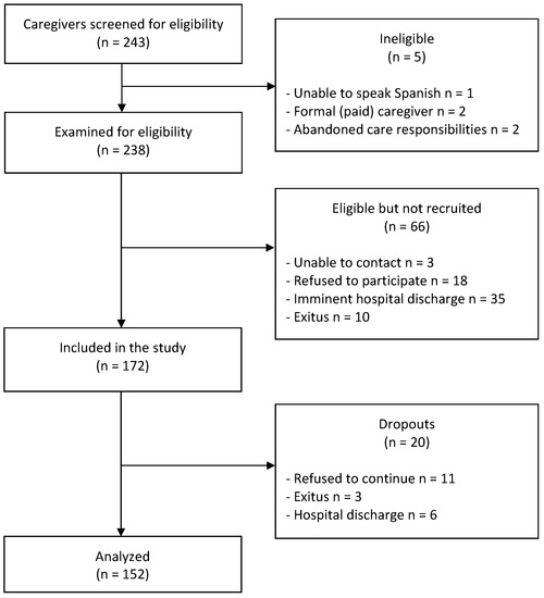 Data were collected from January 2017 until just before the pandemic situation in our country (March 2020) via individual interviews. Given that one of the future objectives of this line of research is to build a cohort of informal caregivers, sample size was not previously predetermined and as many caregivers as met the inclusion criteria were included in the study. A total of n = 152 caregivers were evaluated. The study took place in Virgen de las Nieves University Hospital and San Cecilio University Hospital (Granada, Spain). Under the functional plan of the two main hospitals of the city for providing support to informal caregivers, inclusion criteria included: (i) being over 18 years and under 85 years old; (ii) being able to speak Spanish; (iii) providing care to a family member at the hospital; and (iv) meeting hospital criteria to become an ICHP [21]. Exclusion criteria included: (i) serious medical conditions which would hamper the provision of care or pregnancy; (ii) suspected or diagnosed sleep disorders; (iii) serious psychological problems such as psychotic disorders, major depression, suicidal ideation, or substance abuse; (iv) financial remuneration from the patient or other member of the family for the care provided; (v) hospital discharge in the three coming days from the start of the evaluation.