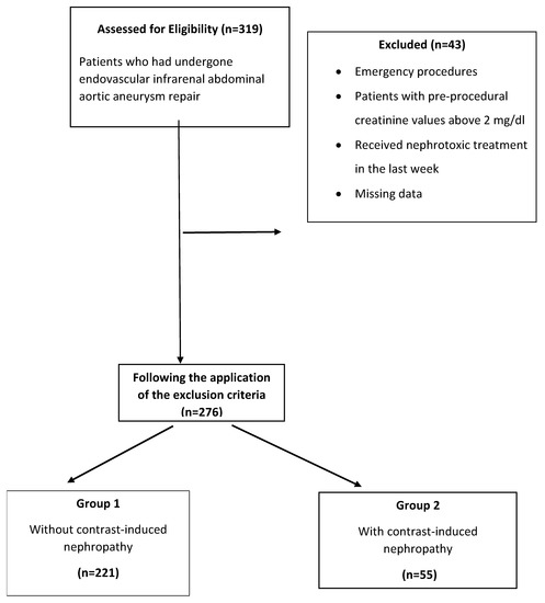 Patients who had undergone elective endovascular infrarenal abdominal aortic aneurysm repair in our clinic between January 2015 and January 2022 were included in the study. Patients who had undergone emergency treatment, patients with pre-procedural creatinine values above 2 mg/dL, those who received nephrotoxic treatment in the preceding week (antibiotherapy due to infection, chemotherapy, etc.), and those with missing data were excluded from the study. After applying the exclusion criteria, 276 consecutive patients were included in the study (Figure 1).