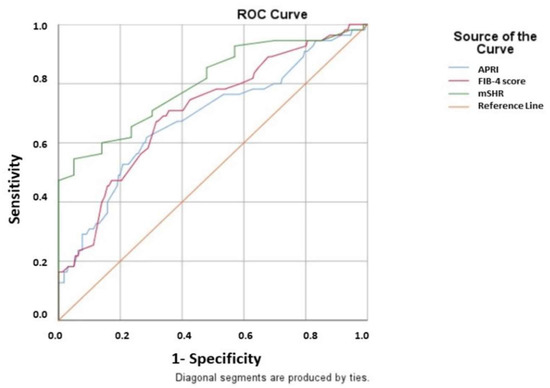 ROC curve analysis revealed that the cut-off value for mSHR was 1.49 (AUC: 0.801, 95% CI: 0.727–0.874, p < 0.001, with 70.9% sensitivity and 68.3% specificity), for FIB-4 score was 1.52 (AUC: 0.707, 95% CI: 0.629–0.785, p < 0.001, with 69.1% sensitivity and 64.8% specificity), and for APRI was 0.28 (AUC: 0.681, 95% CI: 0.596–0.766, p < 0.001, with 61.8% sensitivity and 66.7% specificity) (Figure 2).