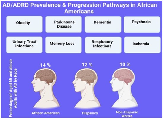 In addition to genetic factors, other risk factors, such as lifestyle, diet, and environmental factors, have also been associated with the increased prevalence of AD/ADRD in the AA community, as shown in Figure 2. A study by the Commission on Dementia Prevention, Intervention, and Care showed that healthy nonsmoking, regular exercise, limited alcohol use, adequate sleep, and high-quality diets were protective against the onset and progression of AD []. The progression of cognitive decline and AD/ADRD correlates with classic cardiometabolic risk factors, such as a sedentary lifestyle, central obesity, dyslipidemia, insulin resistance, hypertension, diabetes, and cardiovascular disease. On the other hand, calorie restriction, dietary elements that are high in antioxidants, and certain dietary patterns may slow the progression of metabolic and neurodegenerative illnesses. The immune system is known to be regulated by nutritious foods high in antioxidants and anti-inflammatory characteristics. Furthermore, these foods may alter the neuroinflammatory processes implicated in the evolution of cognitive impairment and AD [].
