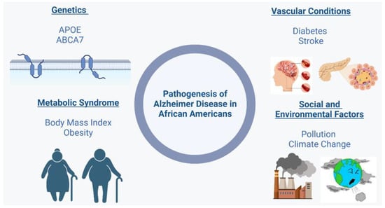 Pathogenic mechanisms of Alzheimer’s Disease in African Americans including genetic factors, vascular conditions, metabolic syndromes, and social and environmental factors.