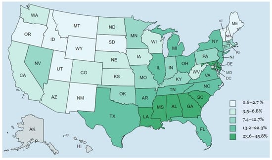 According to the US Census Bureau, the US population, excluding people who identify as bi- or multiracial, is estimated to be composed of 76.5% white and 13.4% AAs. The AA population distribution in different states of the US is presented in Figure 3. In comparison to other racial groupings, AAs had the greatest reported risk of ADRD among persons 65 years and older [,,]. For instance, empirical estimates indicate that the prevalence of AD in Black people is highly variable, ranging from 14% to 500% higher than that of white people [,,]. It is believed that several factors contribute to this discrepancy in the risk of AD among AAs, including genetics, lifestyle factors, socioeconomics, and other comorbidities (e.g., hypertension, diabetes mellitus, stroke, myocardial infarction, and congestive heart failure) [,,]. Other sociological factors, including healthcare access/insurance coverage, systemic racism, clinical presentation, and the timing of diagnosis, further exacerbate these disparities in dementia care [,,,]. Furthermore, the clinical presentations among AA patients with dementia typically include neuropsychiatric symptoms, such as hallucinations, delusions, agitation, aggression, apathy, depression, and insomnia, that are reported less frequently in other ethnic and minority groups [,,,,]. Compared to white people, AAs may display different clinical signs of Alzheimer’s disease due to their tendency to present at a younger age and with more severe symptoms []. This is consistent with the studies that AAs are less likely to seek medical care and when they do, present more severe symptoms []. In addition, AAs are also less likely than white people to obtain Alzheimer’s medications such as acetylcholinesterase inhibitors or memantine []. Therefore, further research on how such discrepancies affect the prevalence of cognitive diagnoses related to AD is required, given the well-documented health disparities that exist between racial groups in the US.